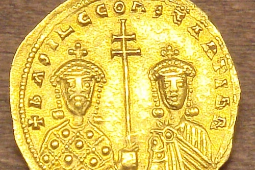Altın paranın bir tarafında İsa'nın İncil tuttuğunu, diğer tarafında ise Bizans İmparatorluğu'nu yöneten iki kardeş olan II. Basil ve VII. Konstantin'in resimlerini gösteriyor.