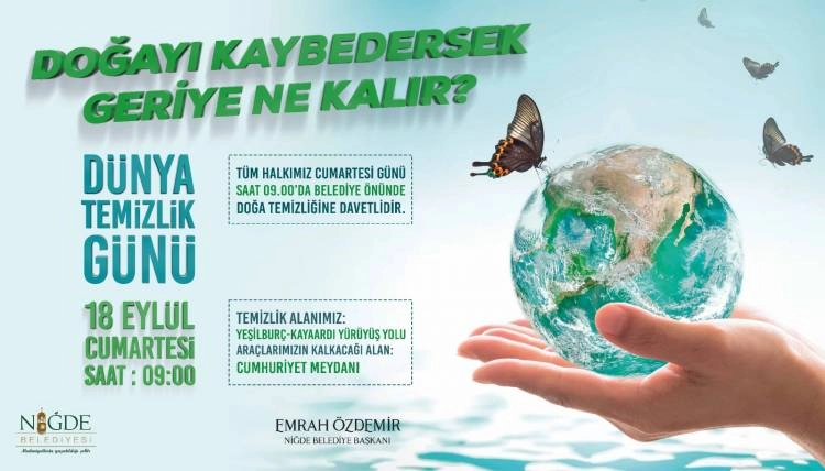 Temizlik seferberlik kapsamında 18 Eylül Cumartesi günü saat 09.00'da Niğde Belediyesi önü; Niğde Belediye Başkanı Emrah Özdemir tarafından farkındalık oluşturmak amacıyla süpürülecek.