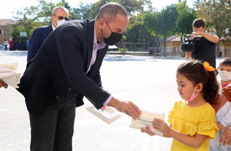 Öğrencilere dağıtılan sağlık çantalarında maske ve kolonya bulunuyor.