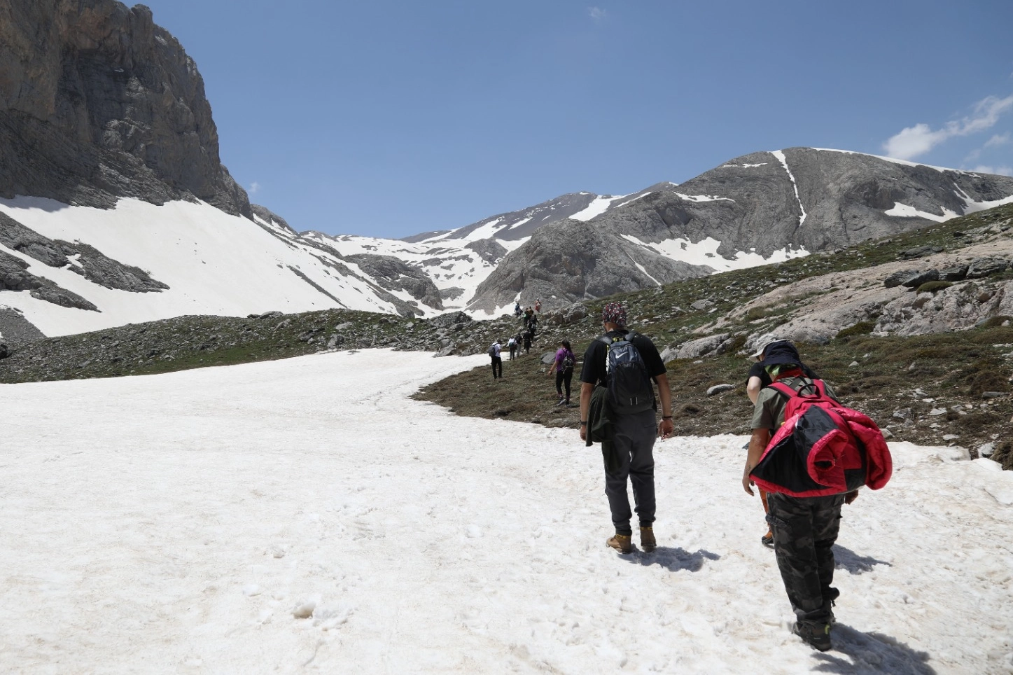 katılımcıların 30 derece sıcaklıkta, Meydan Yaylasından başlayan doğa yürüyüşü buzul göllere yaklaştıkça kar üzerinde devam etti.