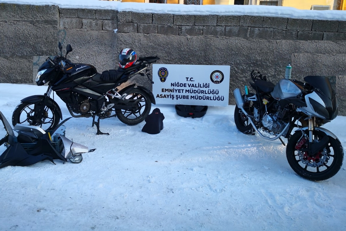 Niğde Asayiş Şube Müdürlüğü ekiplerince; mala karşı işlenen suçlarla mücadele kapsamında 19 Ocak 2022 tarihinde il merkezinde çalınan motositlet, motor ve şasi nosu kazınarak boyanmış başka bir motosiklet, çok sayıda motosiklet parçası ve boya malzemesi ele geçirildi.