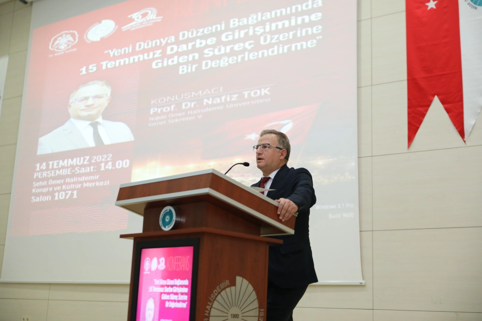 Niğde Ömer Halisdemir Üniversitesi Şehit Ömer Halisdemir Kongre ve Kültür Merkezinde, Genel Sekreter Vekili Prof. Dr. Nafiz Tok’un sunumuyla “Yeni Dünya Düzeni Bağlamında 15 Temmuz Darbe Girişimine Giden Süreç Üzerine Bir Değerlendirme” adlı konferans gerçekleştirildi.