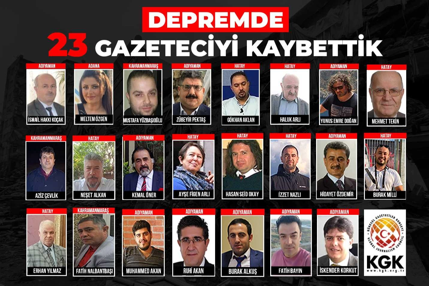 Deprem bölgesinde özellikle 10 gazetecinin yaşamını yitirdiği Adıyaman ile 9 gazeteciyi kaybeden Hatay başta olmak üzere Kahramanmaraş ve Malatya’da çok sayıda gazete basım tesisi başta olmak yerel televizyon ve radyo binaları ile bir çok medya ofisinin ya tamamen yıkılarak enkaza dönüştüğünü ya da kullanılamaz hale geldiğini de belirten KGK Genel Başkanı Dim, “Şu anda yayınlarını da sürdüremeyen bu medya işletmelerini yeniden ayağa kaldırmak için gerekli kamusal desteklerin sağlanması için gayret göstereceğiz. Basın İlan Kurumu’nun bu ay yapılacak genel kurul toplantısında da bu konuyu dile getireceğiz ve yönetmeliğe geçici bir madde eklenmesini talep edeceğiz” dedi. Depremde yaşamını yitiren gazetecilerin isimleri, şehirleri ve kurumları şöyle: