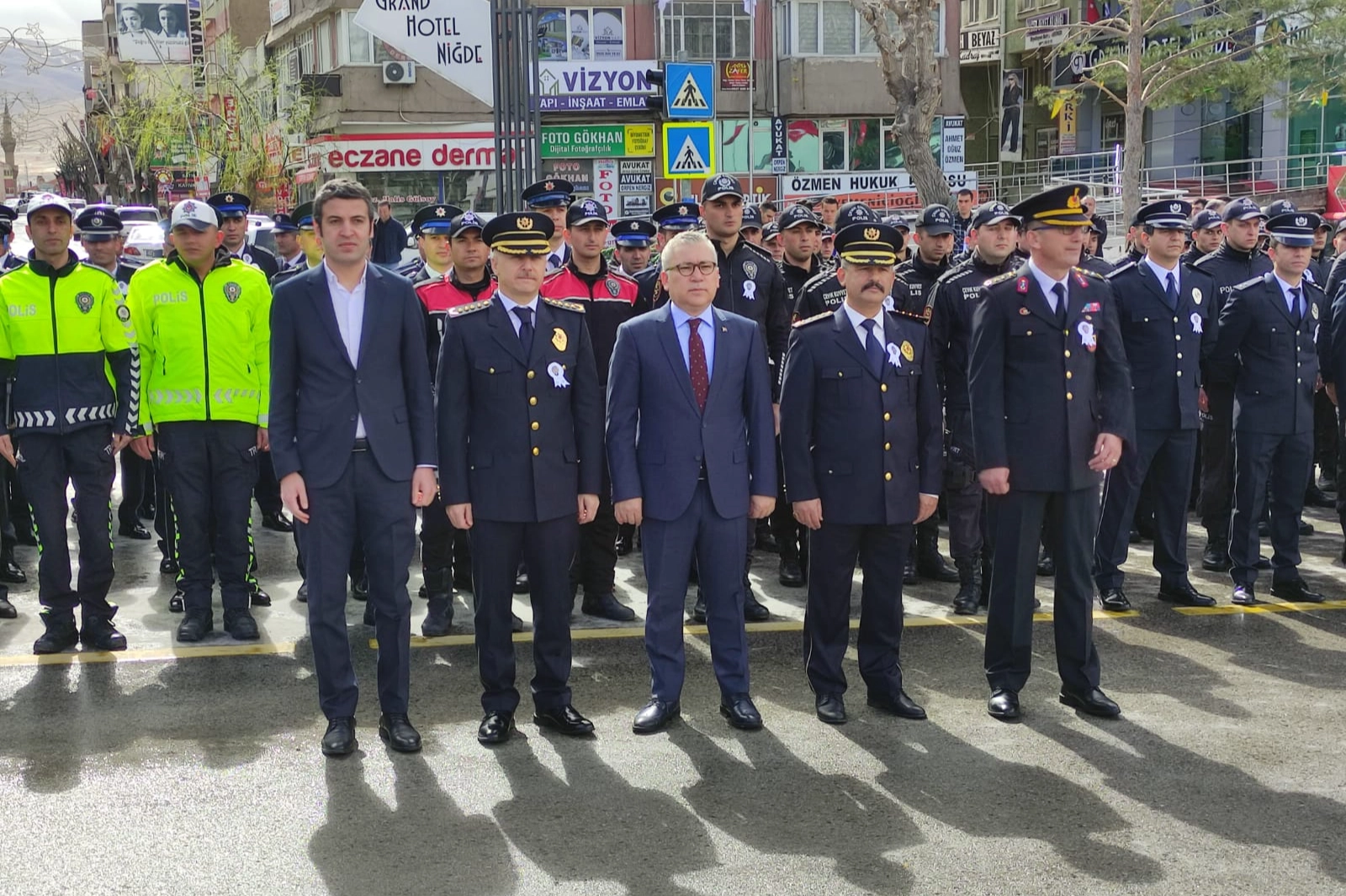 Niğde’de Türk Polis Teşkilatı'nın 177. kuruluş yıl dönümü dolayısıyla tören düzenlendi. Cumhuriyet meydanında düzenlenen törende İl Emniyet Müdürü Adnan Özdemir ve Niğde Polis Meslek Eğitim Merkezi Müdür Mehmet Kemal Arısoy Atatürk Anıtı'na çelenk sundu. Tören saygı duruşu ve İstiklal Marşı'nın okunmasıyla devam etti. Günün anlam ve önemini belirten konuşmasını Niğde İl Emniyet Müdürü Adnan Özdemir yaptı. Özdemir konuşmasında; Kurulduğu günden bu yana kamu düzeninin korunması, asayiş ve güvenliğin sağlanması amacıyla görev yapan teşkilatımız, suç ve suçlularla olan başarılı mücadelesini her geçen gün artırarak sürdürmektedir. Temel hak ve özgürlüklere saygılı, hukukun üstünlüğü anlayışıyla hareket eden teşkilatımız, nitelikli personel yapısı, teknik ve fiziki kapasitesi, çağın gerekliliklerine uygun donanımı ile aziz milletimize hizmet etmenin haklı gururunu taşımaktadır. Gücünü yasalardan ve milletinden alan emniyet teşkilatı, 177 yıldır olduğu gibi bu günde her türlü terör ve şer odaklarına karşı, tereddütsüz bir şekilde devletinin ve milletinin emrinde olmaya devam edecektir. Emniyet teşkilatımızın 177. kuruluş yılı vesilesiyle, başta Gazi Mustafa Kemal Atatürk ve silah arkadaşları olmak üzere, tüm şehitlerimizi rahmetle anarken gazilerimizi ise minnetle yad ediyorum.’’ dedi. Niğde Cumhuriyet Meydanında düzenlenen törene Niğde Valisi Yılmaz Şimşek, Niğde İl Emniyet Müdürü Adnan Özdemir, Niğde İl Jandarma Komutanı Jandarma Albay Nihat Özkök, siyasi parti temsilcileri, şube müdürleri ve vatandaşlar katıldı.