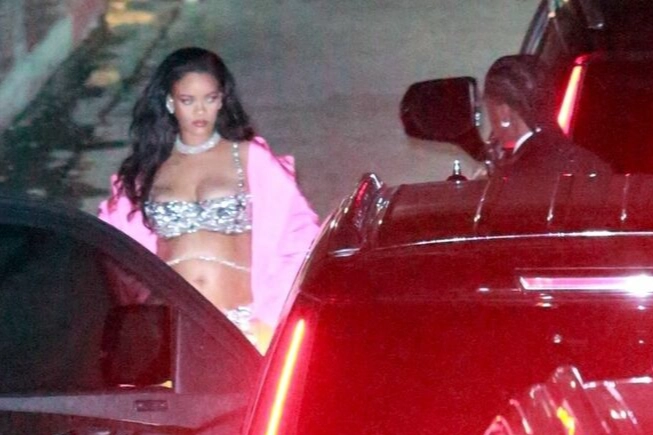Rihanna katıldığı partide gümüş rengi bir etek-büstiyer takımının üzerine pembe bir cüppe giydi.