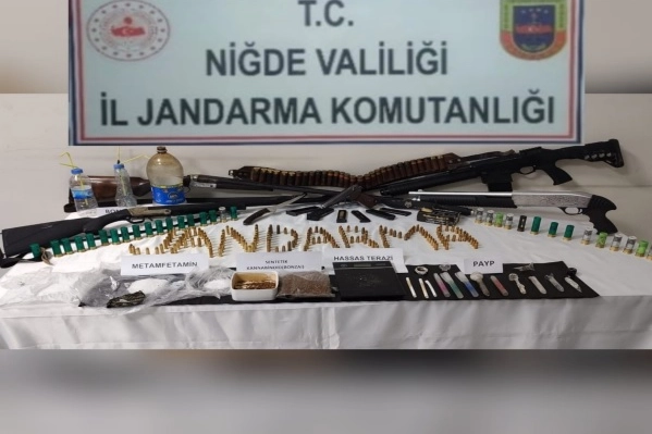 5 ayrı adreste narkotik ve bomba arama köpeği desteği ile yapılan aramada, 1 adet hassas terazi, 153 gr. Bonzai, 125 gr. Meteamfetamin uyuşturucu maddeler ile 10 adet uyuşturucu içiminde kullanılan aparat, 1 adet ruhsatsız tabanca, 4 adet ruhsatsız av tüfeği, 6 adet tabanca şarjörü, 1 adet av tüfeği şarjörü, 213 adet değişik çapta tabanca fişeği, 63 adet av tüfeği fişeği ve 2 adet bıçak ele geçirildi.