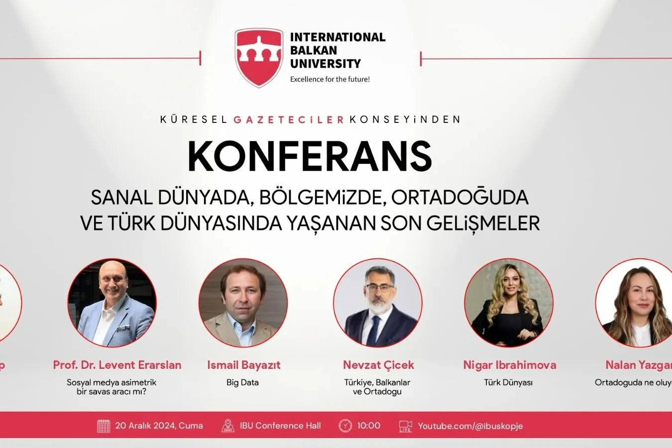 Balkanlar ve Ortadoğu’da Medya Diplomasi Konuşulacak KGK Genel Başkanı Mehmet Ali Dim, konferansta "Balkanlar ve Ortadoğu'da medya diplomasisi" konusunu ele alacak. Ayrıca, Prof. Dr. Levent Eraslan sosyal medyanın asimetrik bir savaş aracı olup olmadığına dair görüşlerini paylaşacak. Nigar İbrahimova, Türk dünyasında yaşanan gelişmeleri anlatırken, Nevzat Çiçek ise Türkiye, Balkanlar ve Ortadoğu üzerine konuşacak.