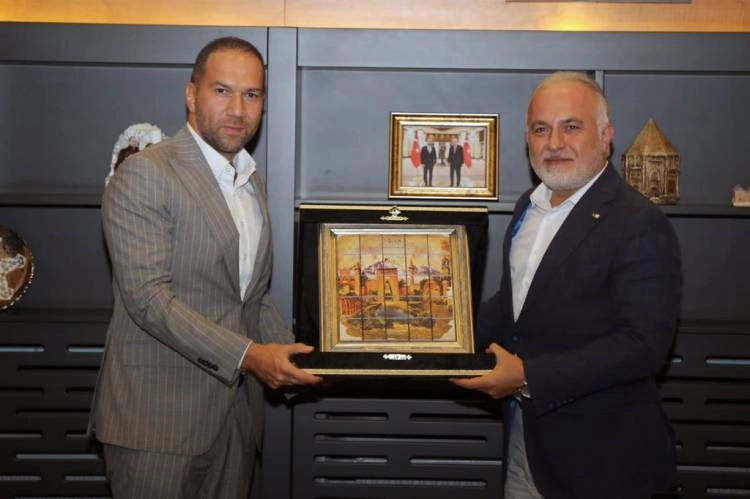 Özdemir ziyaretleri ve dünya genelinde yaptıkları hizmetlerden dolayı Kızılay Genel Başkanı Kerem Kınık'a Niğde plaketi takdim etti.