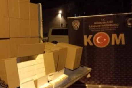 Niğde İl Emniyet Müdürlüğü, Kaçakçılık ve Organize Suçlarla Mücadele Şube Müdürlüğünün çalışmaları kapsamında iki kamyon ve bir çekici dorsesinde 7 milyon 250 bin adet gümrük kaçağı makaron ele geçirildi.
