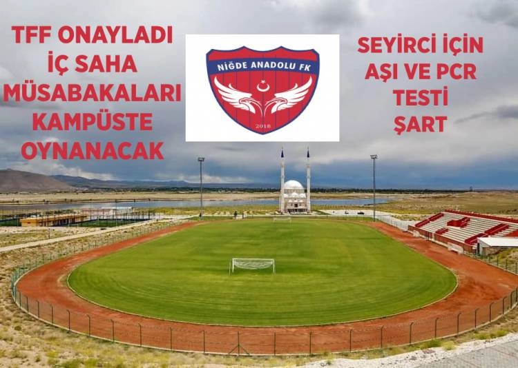 "Niğde Anadolu FK İç Saha Müsabakalarını Niğde Ömer Halisdemir Üniversitesi Kampüs Sahasında oynayabilmek üzere gerekli prosedürü tamamlamış ve TFF tarafından Stadyum Tescil edilmiştir. Müsabakaların Niğde dışında oynanmasının İlimiz ve Ülke Kamuoyunda yaratacağı problem göz önüne alınarak tüm şartlar zorlanmış ve Kampüs Sahası hazır hale getirilmiştir. Pandemi kuralları ve Stadyum imkânları çerçevesinde stada sınırlı sayıda biletli seyirci alınacaktır. Sahaya girişler Kampüsün sadece Koyunlu Kapısında yapılacaktır. Müsabakayı izlemek isteyen seyircilerimizin Aşı Takvimini tamamlamış olmaları veya PCR Testi yaptırmış olmaları gerekmektedir. Şartlarını tamamlamış tüm seyircileri 12 Eylül Pazar günü maçımıza bekliyoruz. Kamuoyuna saygıyla duyururuz."