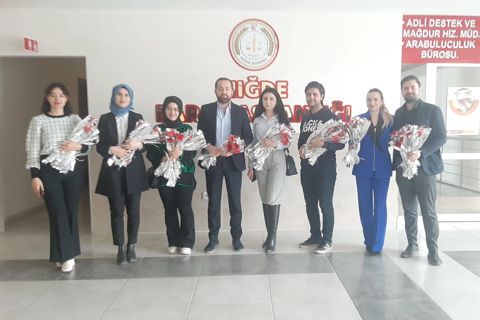 Niğde Barosu Kadın Hakları Komisyonu 8 Mart Dünya Kadınlar günü vesilesiyle İskenderun Hatay da çadırkenti ziyaret etti ve hijyen kiti dağıtarak günün anlam ve önemine binaen basın açıklaması yaptı. Komisyon ayrıca Niğde Adliyesinde Avukat, Hakim, Savcı, Adliye Personeli ve vatandaşa karanfil dağıttı.