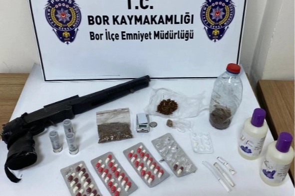 Bor İlçe Emniyet Müdürlüğü ekiplerince ilçede bulunan bir iş yerine yapılan operasyonda 2 şüpheli şahıs yakalandı. İfadeleri alındıktan sonra şahıslardan 1'i serbest bırakılırken diğeri çıkarıldığı mahkeme tarafından tutuklanarak cezaevine gönderildi. Polis ekipleri tarafından şahısların iş yerinde yapılan aramalarda: 44 adet Sentetik Ecza maddesi, 41.72 gr. Sentetik Kannabinoid maddesi, 1 adet tüfek, 3 adet tüfek fişeği, 2 adet uyuşturucu madde yapında kullanıldığı düşünülen aseton ve 1 adet hassas terazi ele geçirildi.