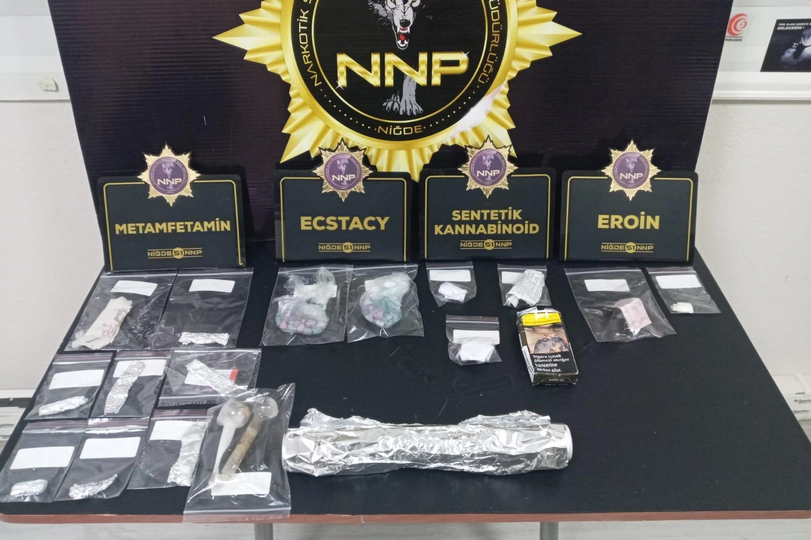 Yapılan aramalarda; 5,76 gram ağırlığında METAMFETAMİN maddesi, 2.36 gram ağırlığında SENTETİK KANNABİONOİD maddesi, 1,60 gram ağırlığında EROİN maddesi, 49 adet ECSTACY hap ele geçirildi.