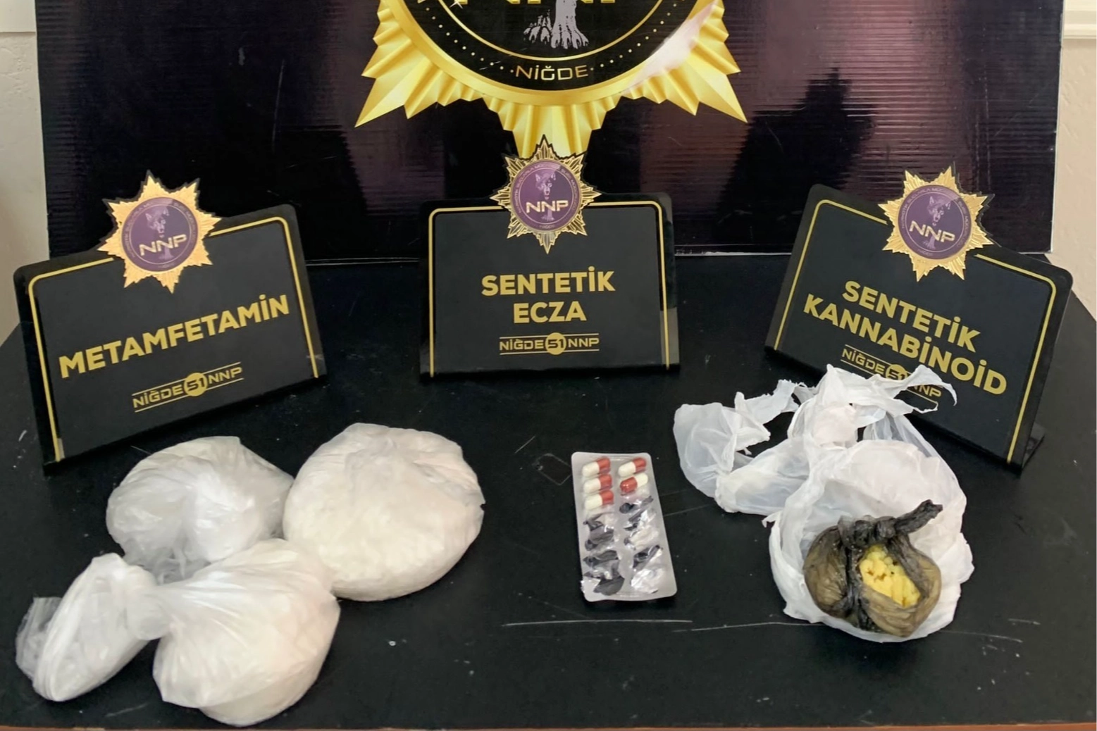 604,78 Gram Metamfetamin Maddesi, 259,71 Gram Sentetik Kannobinoid Maddesi, 185,43 Gram Esrar Maddesi, 160 Adet Sentetik Ecza Maddesi, 23,84 gram Eroin Maddesi, 10 Adet Pipe (Uyuşturucu madde kullanımı için aparat), 2 Adet Ruhsatsız Tabanca ve 39 fişek ele geçirildi. Yakalanan şüpheli şahıslar hakkında TCK'nın 188. ve 191. Maddeleri gereğince gerekli işlemler yapıldı. 9 şüpheli şahıs ise çıkarıldıkları mahkeme tarafından tutuklandı.