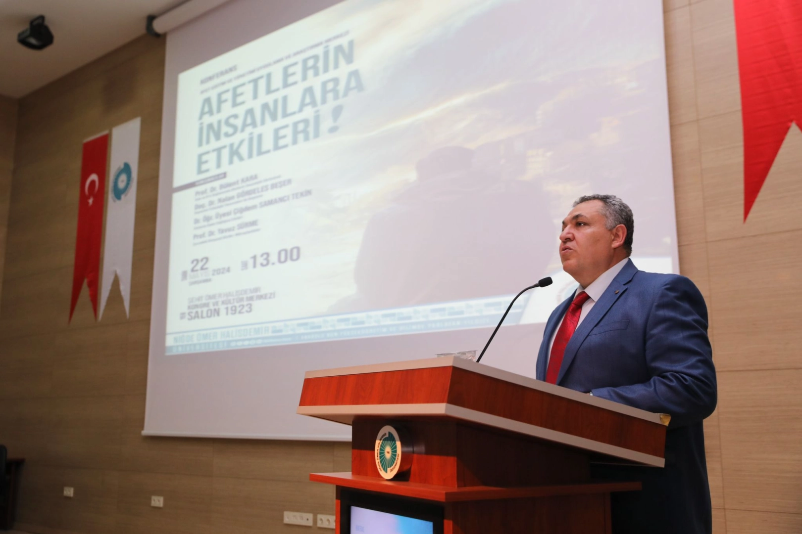 Şehit Ömer Halisdemir Kongre ve Kültür Merkezi'nde düzenlenen konferansa Rektör Yardımcısı Prof. Dr. Ersin Aydın, Afet Eğitim ve Yönetimi Uygulama ve Araştırma Merkezi Müdürü Prof. Dr. Mustafa Korkanç, akademik ve idari birim yöneticileri ile personel ve öğrenciler katıldı. Konferansın açılış konuşmasını yapan Korkanç, 6 Şubat 2023’te meydana gelen Kahramanmaraş merkezli depremleri hatırlatarak deprem, sel, yangın gibi afetlerde psikolojik etkilere değindi.