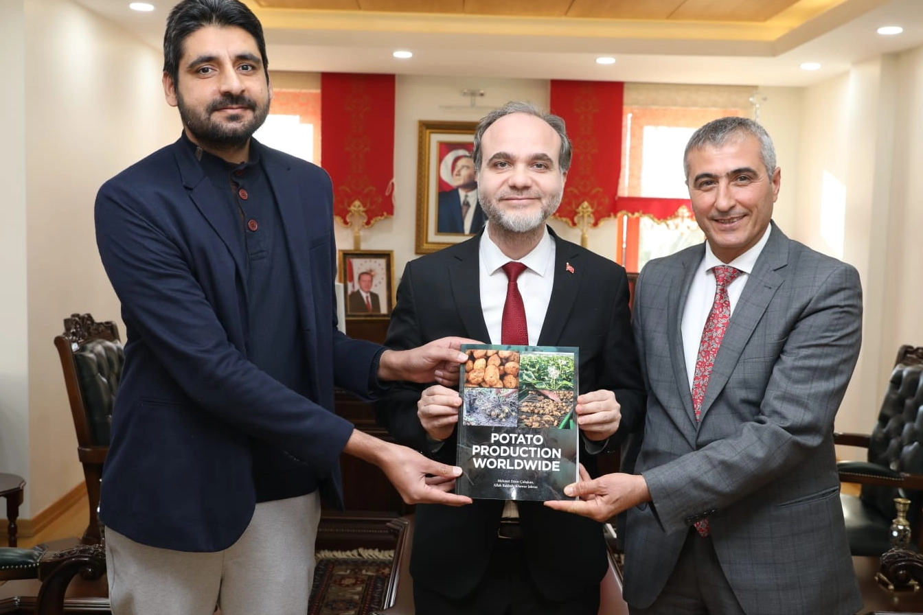 NÖHÜ Tarım Bilimleri ve Teknolojileri Fakültesi Dekanı Prof. Dr. Mehmet Emin Çalışkan ve Bitkisel Üretim ve Teknolojileri Bölümü öğretim üyesi Doç. Dr. Khawar Jabran, editörlüğünü yaptıkları ve Elsevier Yayınevi tarafından basılan "Potato Production Worldwide" isimli kitabı NÖHÜ Kütüphanesine konulmak üzere Rektör Prof. Dr. Hasan Uslu'ya takdim etti.