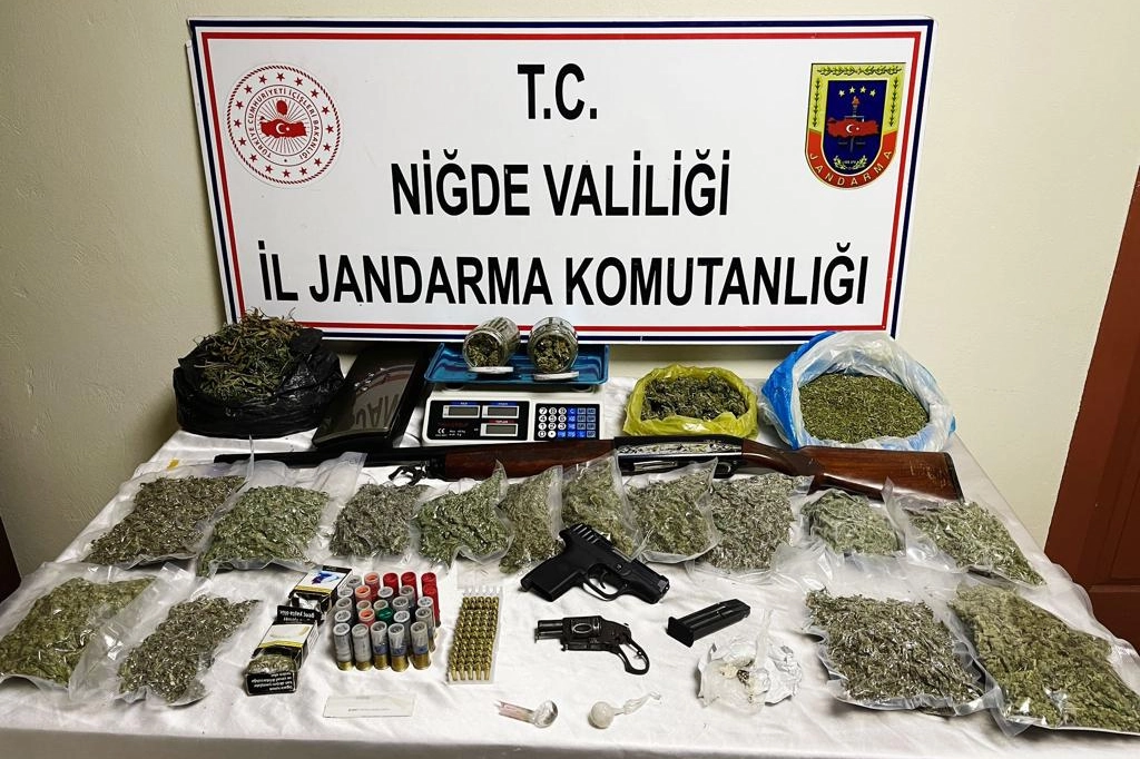 Niğde İl Jandarma Komutanlığı ekiplerince Kaçakçılık ve Organize Suçlarla Mücadele kapsamında; uyuşturucu ve uyarıcı madde kullanan ve ticaretini yapan şahıslara yönelik yapılan istihbarı çalışmalar neticesinde; Niğde İli Merkez İlçesi Kiledere ve Yeşilgölcük Kasabalarında uyuşturucu ve uyarıcı madde kullanan ve ticaretini yapan 2 şüpheli şahsın ev ve eklentilerinde adli makamlardan alınan arama kararına istinaden 18.10.2022 tarihinde yapılan aramada, 5.083 gr kubar esrar, 2 gr metamfetamin, 10 gr kenevir tohumu, 1adet elektronik terazi, 1 adet vakum makinesi ve çok sayıda vakum poşeti, 2 adet ruhsatsız tabanca, bu tabancalara ait 60 adet 9 mm fişek, 1 adet ruhsatsız av tüfeği ve bu tüfeğe ait 26 adet fişek ele geçirildi. Olayla ilgilisi olan 2 şüpheli şahıs gözaltına alınarak, gerekli yasal işlemlere başlanıldı.