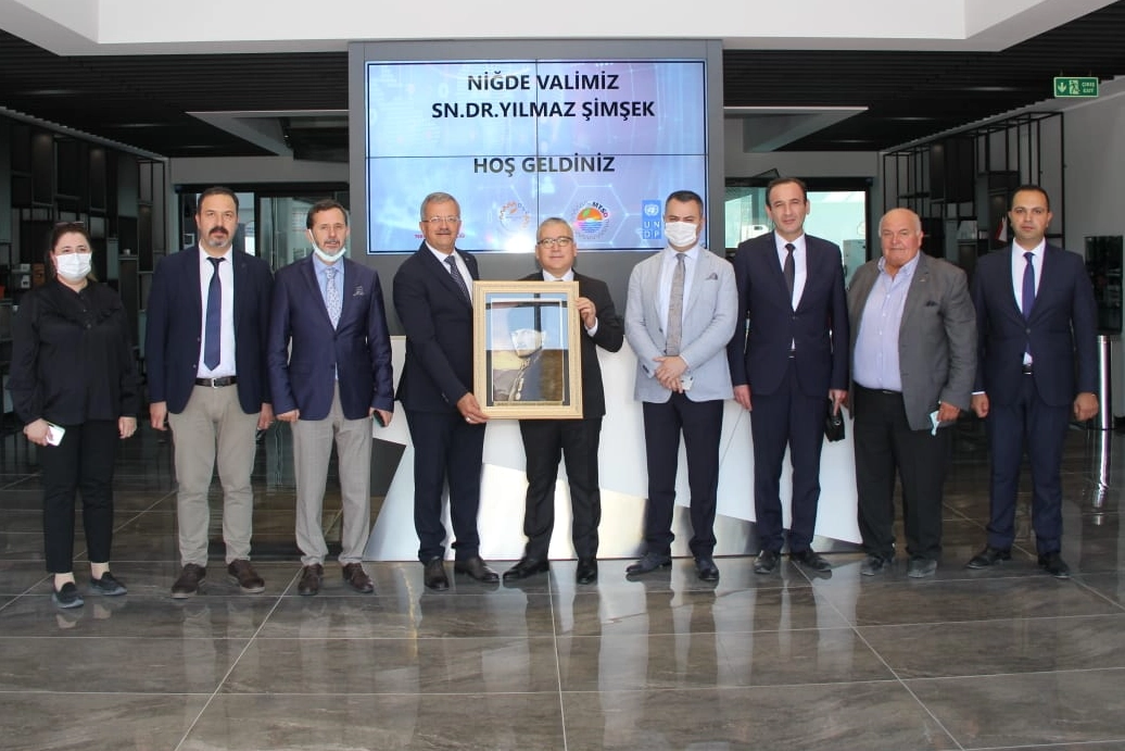 Model Fabrika ve Yenilik Merkezi'ni ziyaret eden Niğde Valisi Yılmaz Şimşek ve beraberindeki heyet, Başkan Tekli ve Merkezin Direktör Yardımcısı Bahittin Aslan'dan merkezin faaliyetleri hakkında bilgiler aldılar.