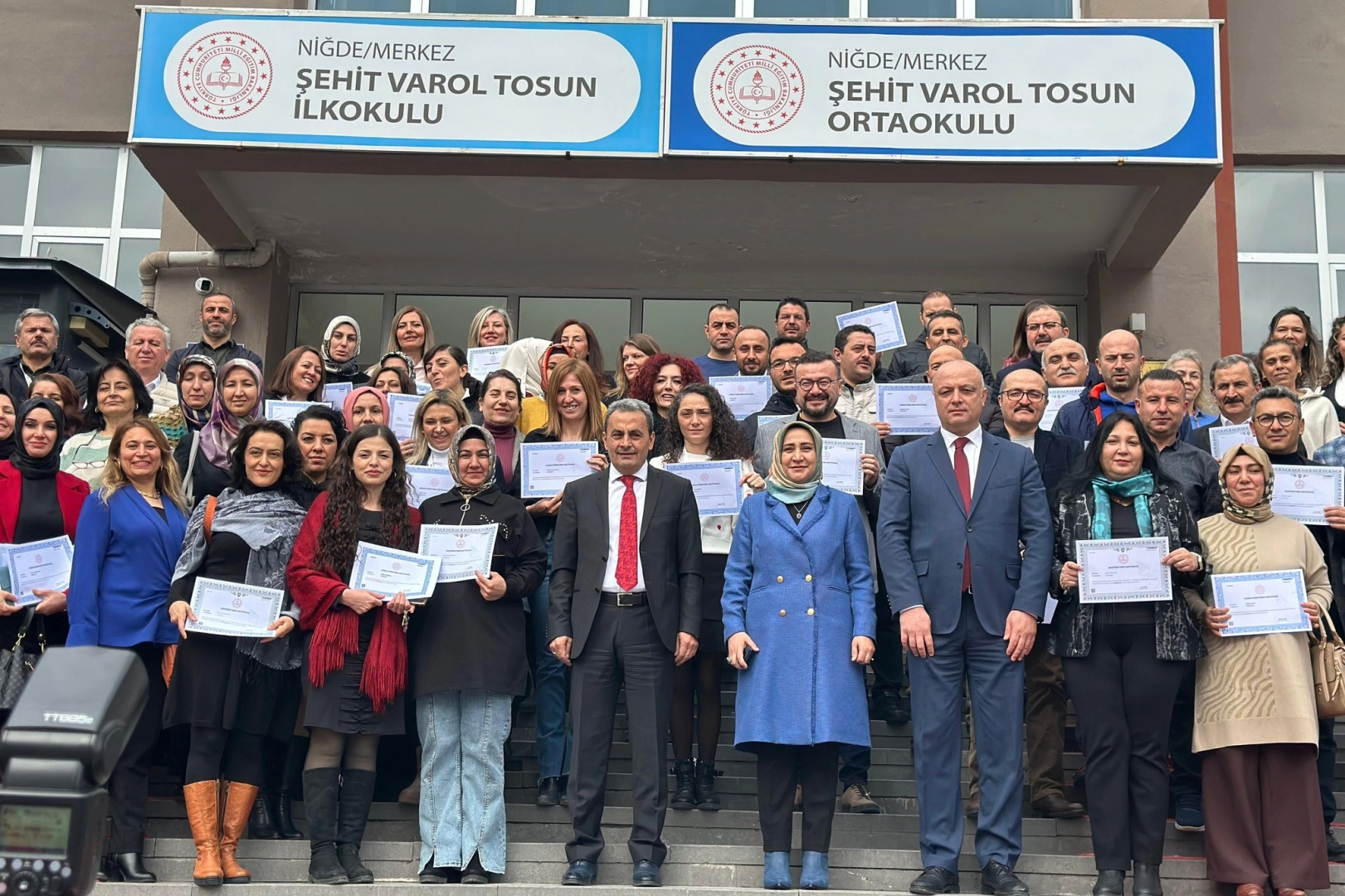 Niğde İl Millî Eğitim Müdürlüğü tarafından düzenlenen törende, "2024 Yılı Öğretmenlik Mesleği Kariyer Basamaklarında İlerlemeye İlişkin Kılavuz" doğrultusunda "başöğretmen" ve "uzman öğretmen" unvanına layık görülen öğretmenlere sertifikaları verildi. Tören, İl Millî Eğitim Müdürü Elif Özbek ile İl Millî Eğitim Müdür Yardımcısı Fatih Altan'ın katılımıyla gerçekleştirilirken, öğretmenlerin mesleki başarıları ve eğitim dünyasına yaptıkları katkılar ön plana çıktı. Etkinlik sırasında, öğretmenlerin özverili çalışmaları takdir edilip, ayrıca Şehit Varol Tosun İlkokulu/Ortaokulu'nda başarılar kutlandı.