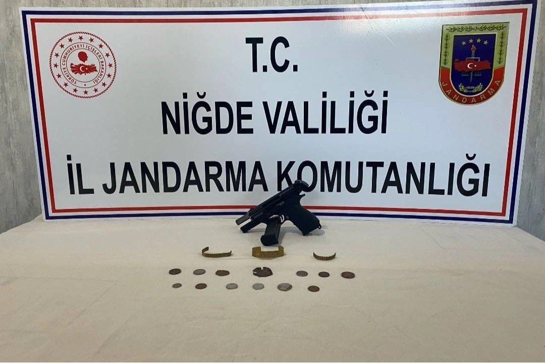 Niğde İl Jandarma Komutanlığınca Kültür ve Tabiat Varlığı Kaçakçılığı ile mücadele kapsamında 25.02.2025 günü Niğde İli Bor ilçesi Çukurkuyu Kasabasında icra edilen faaliyette 1 yabancı uyruklu şüpheli şahsın üzerinde yapılan aramada, Tarihi eser olduğu değerlendirilen 16 adet Obje, 1 adet Sigsauer marka ruhsatsız tabanca ele geçirildi. Olay ile ilgili 1 şüpheli şahıs hakkında gerekli yasal işlemler başlatıldı.