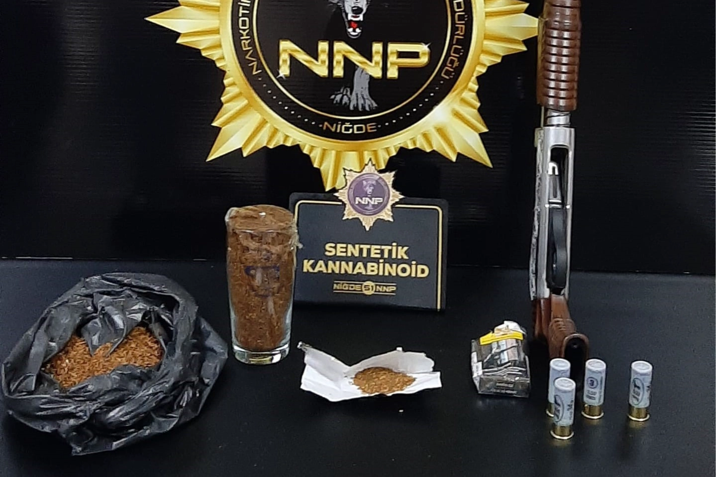 233,223 gr. Sentetik Kannabinoid maddesi, 25,23 gr. Metanfetamin maddesi, 1,03 gr. Eroin maddesi, 0,79 gr. Esrar maddesi, 2,43 gr. Kenevir Tohumu, 1 adet Av Tüfeği, 4 adet Fişeği, 3 adet Uyuşturucu madde kullanım aparatı ele geçirildi.
