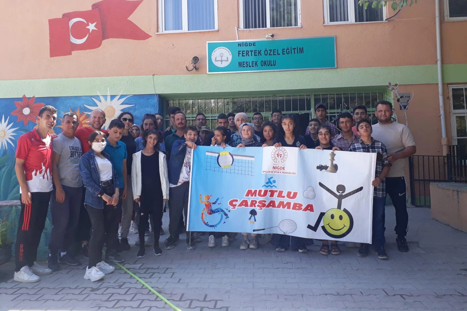 Niğde'de “Mutlu Çarşamba” etkinliği için ilk durak, Fertek Özel Eğitim Meslek Okulu oldu. Birbirinden güzel sportif etkinlikleri ile gençleri buluşturarak onlara farklı spor dallarında eğitim vererek eğlenmeleri sağlandı.