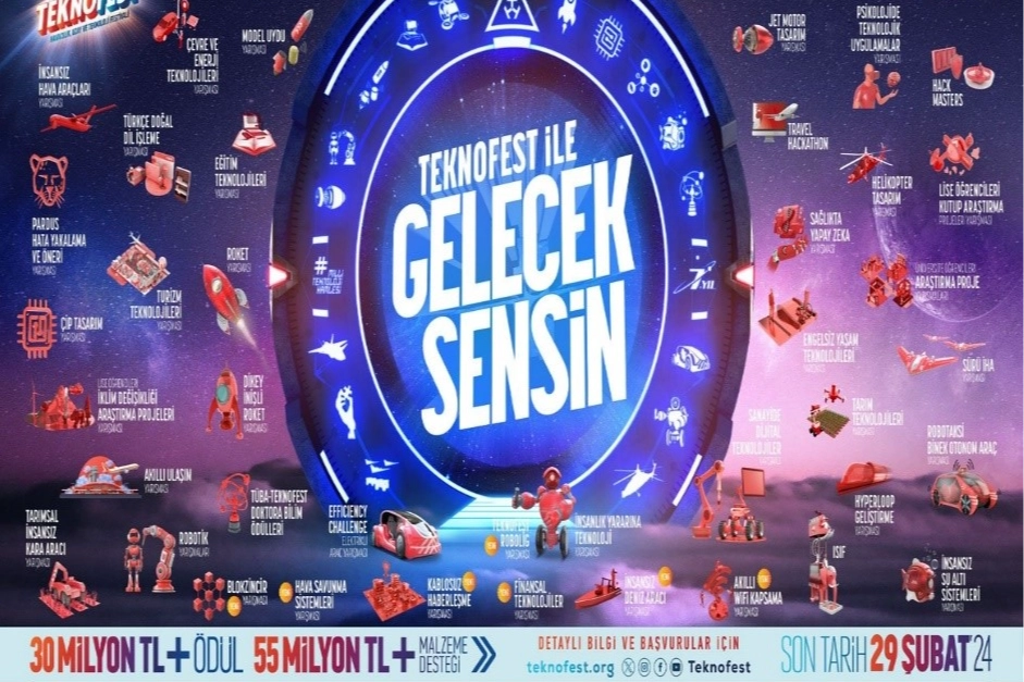 TEKNOFEST Havacılık, Uzay ve Teknoloji Festivali kapsamında düzenlenen dünyanın en büyük teknoloji yarışmaları için başvurular başladı. "TEKNOFEST ile Gelecek Sensin” mottosuyla prestijli yarışmalarda yüksek performans sergileyecek teknoloji tutkunlarına 30 milyon TL ödül ve 55 milyon TL’nin üzerinde malzeme desteği sağlanacak. Her yıl bir önceki yıla göre daha fazla yarışma kategorisinin açıldığı ve Türkiye tarihinin en büyük ödüllü teknoloji yarışmaları olan TEKNOFEST teknoloji yarışmaları bu yıl 46 ana kategori, 117 alt kategoride düzenlenecek. TEKNOFEST 2024 teknoloji yarışmalarına başvurular 29 Şubat 2024 tarihine kadar yapılabilecek.