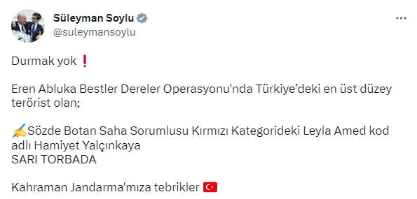 Kahraman Jandarma'mıza tebrikler. " diyerek kırmızı listede yer alan Leyla Amed kod adlı Hamiyet Yalçınkaya'nın adını listeden çizdiklerini duyurdu.