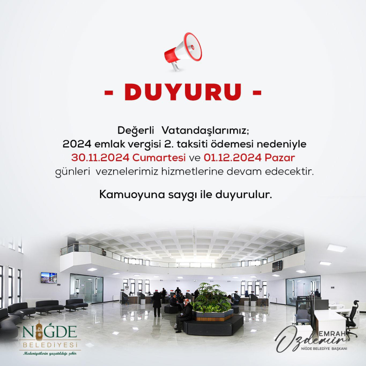 Niğde Belediyesi, emlak vergisi için 30 Kasım ve 1 Aralık tarihlerinde ödeme noktalarını aktif tutacağının duyurusunu, sosyal medya hesaplarından paylaştı. Niğde'de vatandaşlar, emlag vergilerini belediyenin veznelerinden hafta sonu yapabilecekler.
