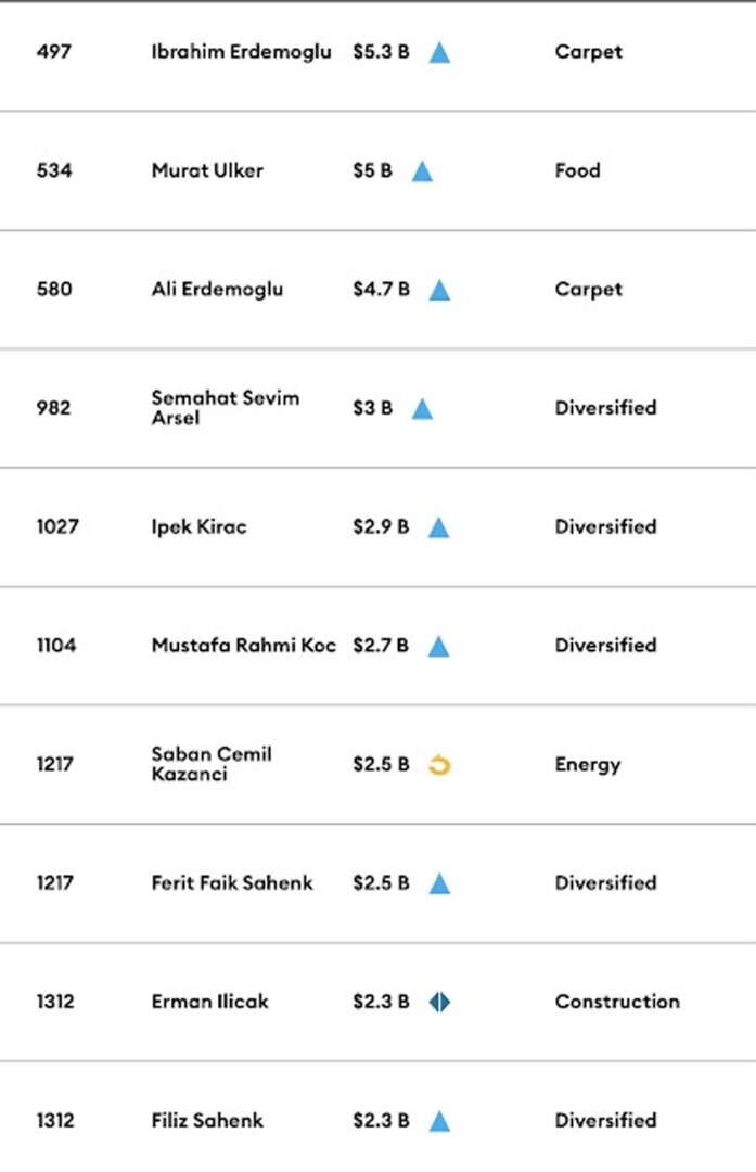 Forbes listesinde yer alan 26 Türk milyarderin 15'inin servetini geçen seneye göre artırdığı gözlemlendi. Listeye göre, Türkiye'nin en zengin milyarderi SASA Polyester'in sahibi İbrahim Erdemoğlu. Servetinin toplam değeri 5 milyar 300 milyon dolar olan Erdemoğlu genel listede 497. sırada yer alıyor. İbrahim Erdemoğlu'nu 534. sırada 5 milyar dolarlık servetiyle Yıldız Holding'in sahibi Murat Ülker izlerken yine SASA Polyester'in sahiplerinden İbrahim Erdemoğlu'nun kardeşi Ali Erdemoğlu ise 4.7 milyar dolarlık servetiyle Türkiye'nin üçüncü, dünyanın 580. zengini olarak öne çıktı.