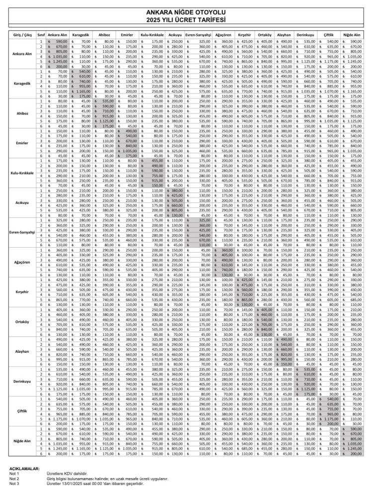 Yeni tarifeyle birlikte Ankara-Niğde Otoyolu'n da fiyat artışına gidildi. Buna göre yeni geçiş ücretlerine yüzde 45 oranında zam yapıldı.