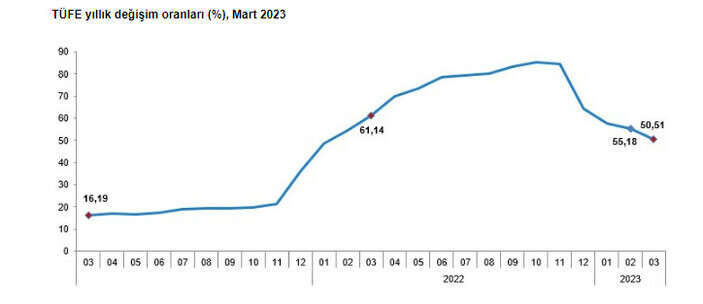 TÜFE'deki değişim ise 2023 yılı Mart ayında, bir önceki aya göre yüzde 2,29, bir önceki yılın Aralık ayına göre ise yüzde 12,52, bir önceki yılın aynı ayına göre yüzde 50,51 ve on iki aylık ortalamalara göre yüzde 70,20 olarak gerçekleşti.