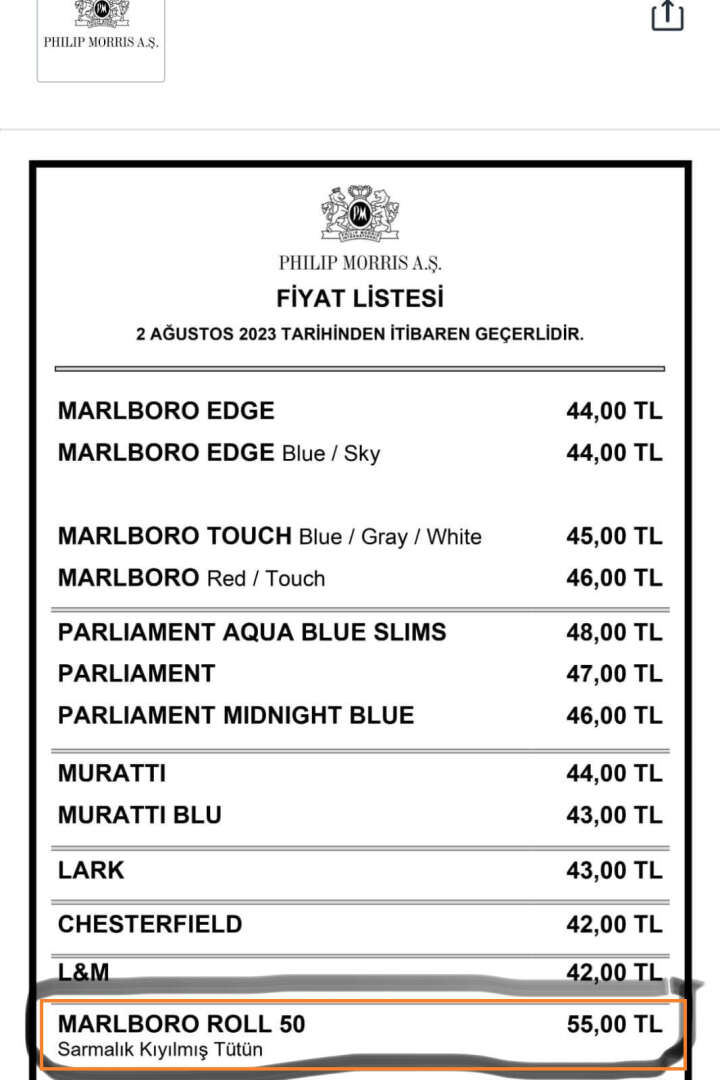 Sigaraya, bugünden itibaren geçerli olmak üzere zam geldi. Philip Morris sigara grubunda Marlboro tütüne 10 TL zam geldi. Marlboro Roll 50 tütün fiyatı 45 liradan 55 liraya çıktı. Bu son zam ile birlikte 1 yılda toplamda 17 TL zam gelmiş oldu.