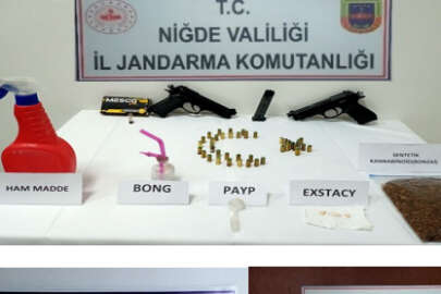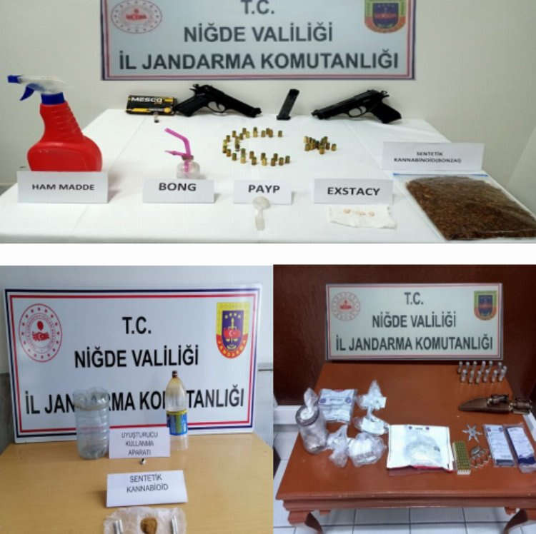 Niğde İl Jandarma Komutanlığınca icra edilen faaliyetler neticesinde; Şüpheli şahısların üst, araç ile ev ve eklentilerinde yapılan aramalarda (180) gr Bonzai, (287) gr Metamfetamin, (5) gr Kubar Esrar, (400) ml Uyuşturucu Madde Yapımında Kullanılan Hammadde, (3) adet Ecstasy Hap, (1) adet 9 mm Tabanca, (2) Adet Kurusıkı Tabanca, (14) adet 9 mm Fişek, (43) Adet Kurusıkı Fişek, (7) Adet Uyuşturucu Madde Kullanma Aparatı ve araçların değişik yerlerine gizlenmiş vaziyette (915) paket çeşitli markalarda kaçak sigara ele geçirildi.