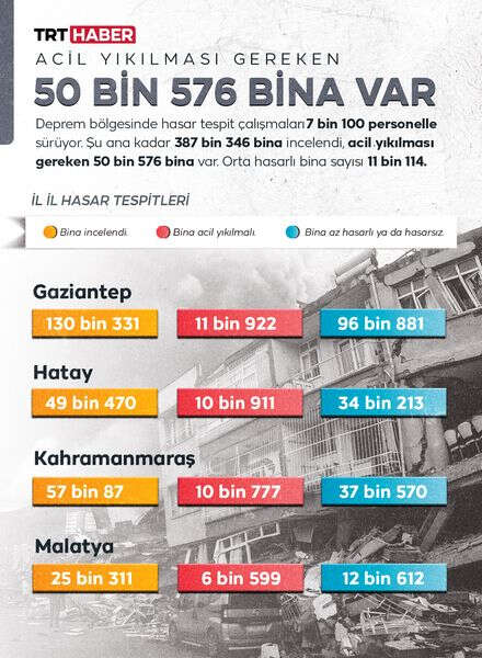 15 Şubat 2023 tarihine kadar 387 bin 346 bina incelendi. Acil yıkılması gereken bina sayısı 50 bin 576 olarak belirtildi.
