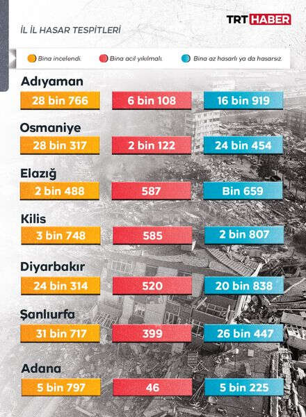 En çok ağır hasarın olduğu bina 11 bin 922 ile Gaziantep olarak görünüyor. Depremin merkez üssü Kahramanmaraş'ta ağır hasarlı ve acil yıkım kararı verilen bina sayısı 10 bin 777, Hatay'da ise 10 bin 911 olarak belirtiliyor.