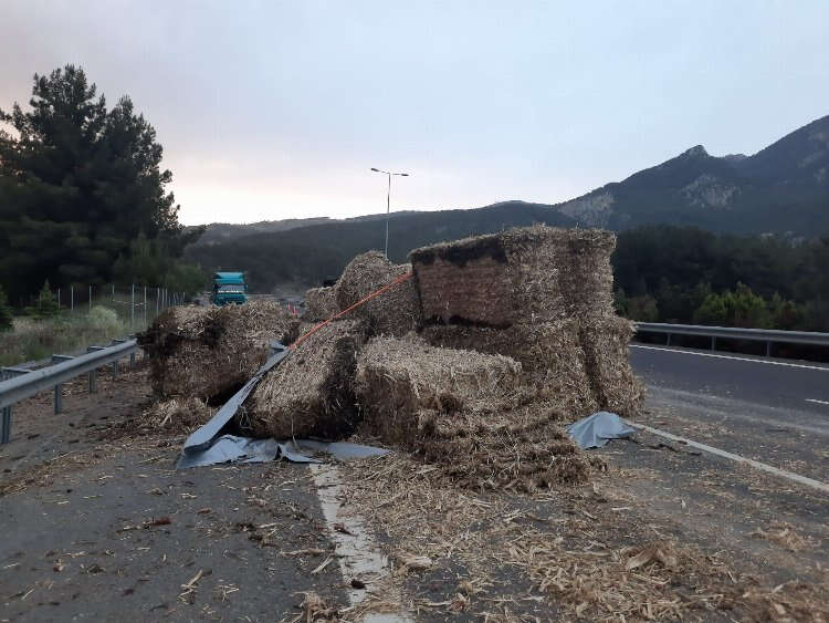 Adana- Niğde otolunda saman yüklü TIR devrildi. Sürücüsünün burnu bile kanamadı.