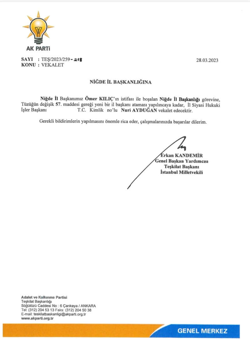 Ak Parti Niğde İl Başkanı Ömer Kılıç'ın aday adayı olması ve akabinde istifası ile boşalan Ak Parti Niğde İl Başkanlığı görevine, tüzük gereği yeni bir il başkanı ataması yapılıncaya kadar, İl Siyasi Hukuki İşler Başkanı Nuri Ayduğan'ın,