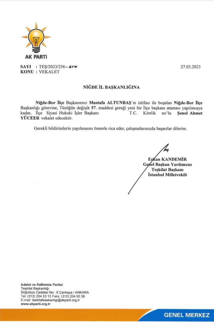 Yine aday adaylığında Bor İlçe Başkanı Mustafa Altunbaş'ın istifası ile boşalan Ak Parti Bor İlçe Başkanlığı görevine yeni bir İlçe başkanı ataması yapılıncaya kadar, İlçe Siyasi Hukuki İşler Başkanı Şenol Ahmet Yüceer'in vekalet etmesine karar verildi.