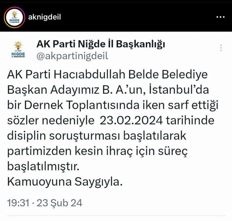 Babaoğlan Altun'a ait skandal görüntülerin ortaya çıkmasının ardından AK Parti Niğde İl Başkanlığı harekete geçti. AK Parti Niğde İl Başkanlığından yapılan açıklamada Altun'a disiplin soruşturması başlatılacağı belirtilerek: "AK Parti Hacıabdullah Belde Belediye Başkan Adayımız B.A.'un İstanbul'da bir dernek toplantısında sarf ettiği sözler nedeniyle 23.02.2024 disiplin soruşturması başlatılarak partimizden kesin ihraç için süreç başlatılmıştır. Kamuoyuna Saygıyla." denildi.