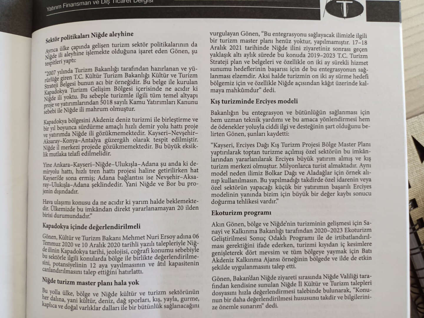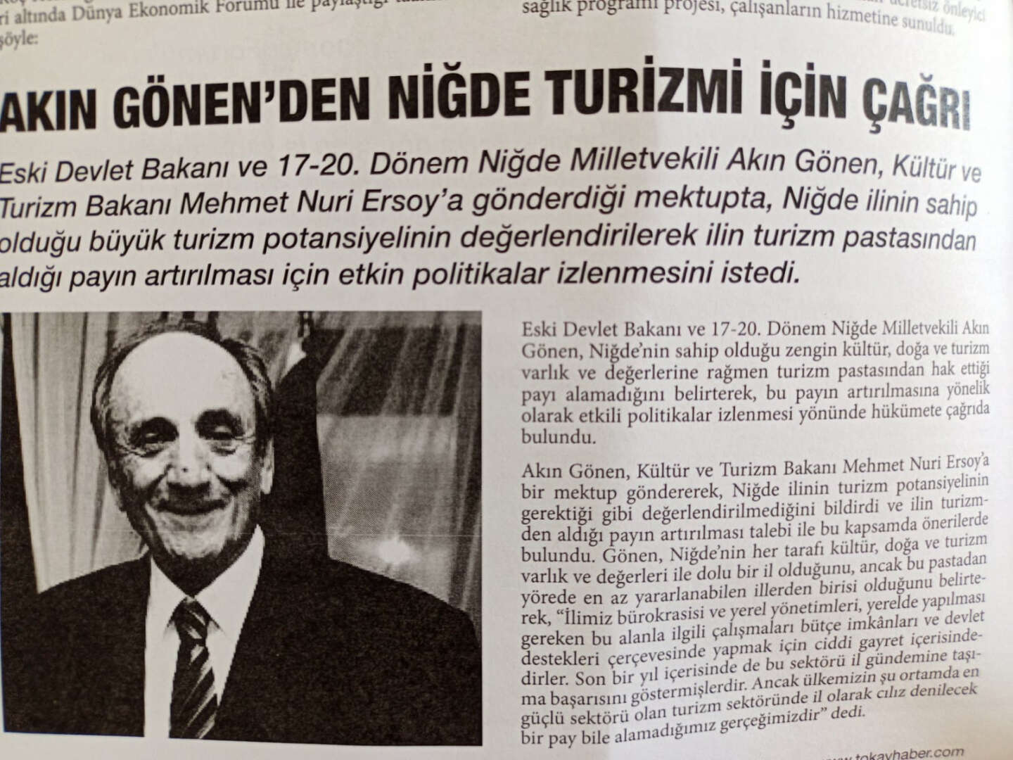 Yatırım Finansman ve Dış Ticaret Dergisinde; "Akın Gönen'den Niğde Turizm İçin Çağrı" başlıklı haberde Gönen'in Kültür ve Turizm Bakanı Mehmet Nuri Ersoy'a açık mektubu ele alındı.