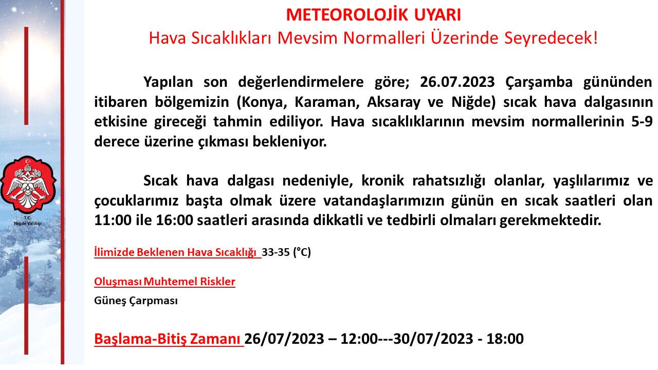 Valilikten gelen açıklamada, aralarında Niğde’nin de bulunduğu Konya, Karaman ve Aksaray’ın sıcak hava dalgasının etkisine gireceği tahmin ediliyor. Hava sıcaklıklarının mevsim normallerinin 5ila 9 derece üzerine çıkması bekleniyor.
