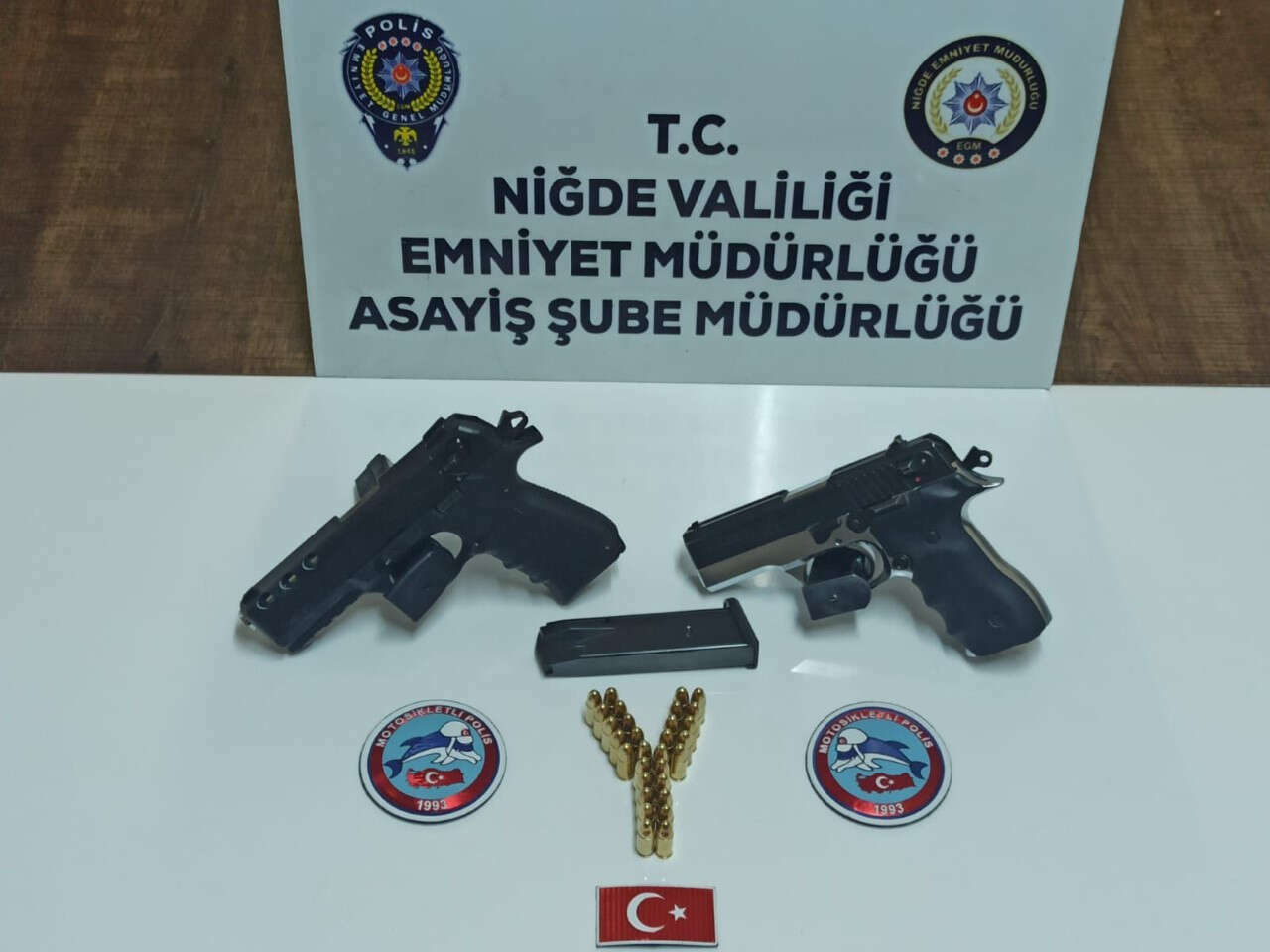 Kişilere ve Mala karşı işlenen suçlarla mücadele kapsamında Müdürlüğümüz Asayiş Şube Müdürlüğüne bağlı Motosikletli Yunus Timlerince 12.10.2021 günü yapılan uygulamalarda; iki adet araçtan bir adet ruhsatsız tabanca ve tabancaya ait 2 şarjör ve 30 adet fişek ve bir adet kurusıkı tabanca ele geçirilmiş, yakalanan iki şüpheli şahıs hakkında 6136 Sayılı Kanuna Muhalefet suçundan gerekli adli işlemler başlatılmıştır. İlimiz genelinde vatandaşların can ve mal güvenliğinin sağlanması konusunda tedbirlerimiz ve meydana gelen olayların aydınlatılması ve faillerin yakalanmasına yönelik çalışmalarımız hassasiyetle sürdürülmektedir."
