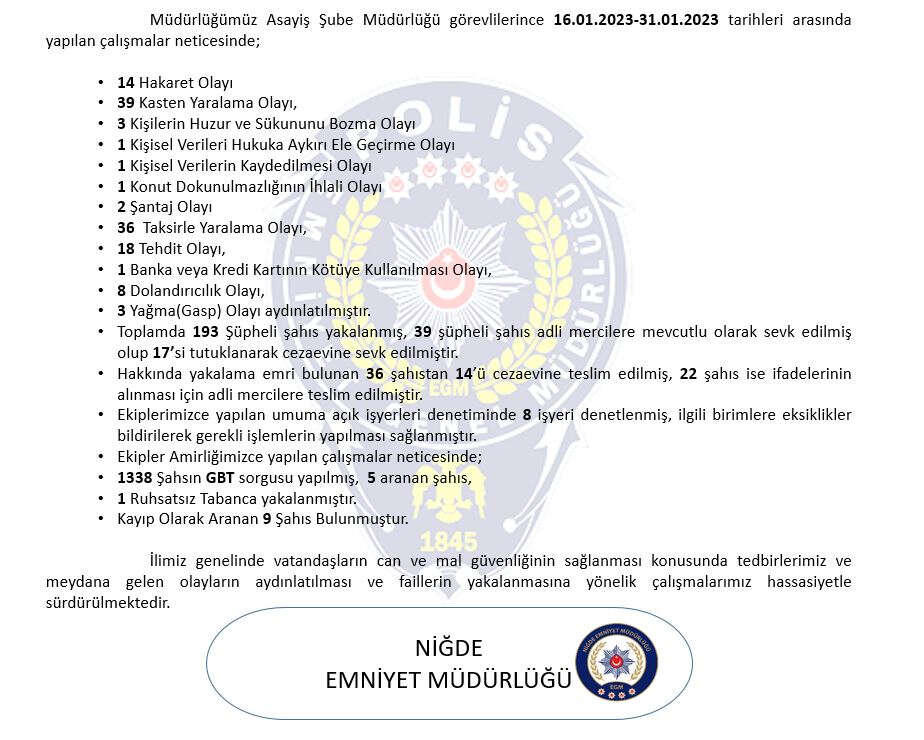 Niğde Asayiş Şube Müdürlüğü görevlilerince 16.01.2023-31.01.2023 tarihleri arasında yapılan çalışmalar neticesinde;