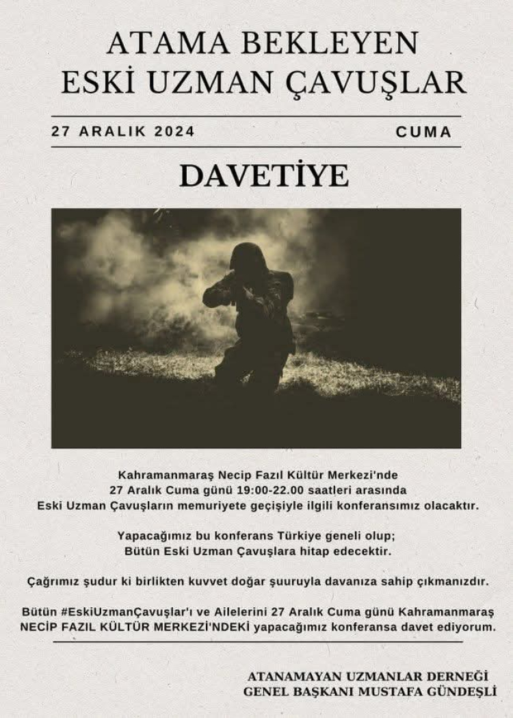 Konferans kapsamında bütün eski uzman çavuşlara hitap edileceği öğrenilirken Atanamayan Uzmanlar Derneği Genel Başkanı Mustafa Gündeşli, '' Çağrımız şudur ki birlikten kuvvet doğar şuuruyla davanıza sahip çıkmanızdır. Bütün eski uzman çavuşları ve ailelerini 27 Aralık Cuma günü Kahramanmaraş Necip Fazıl Kısakürek Kültür Merkezi'nde yapacağımız konferansa davet ediyoruz.'' dedi.