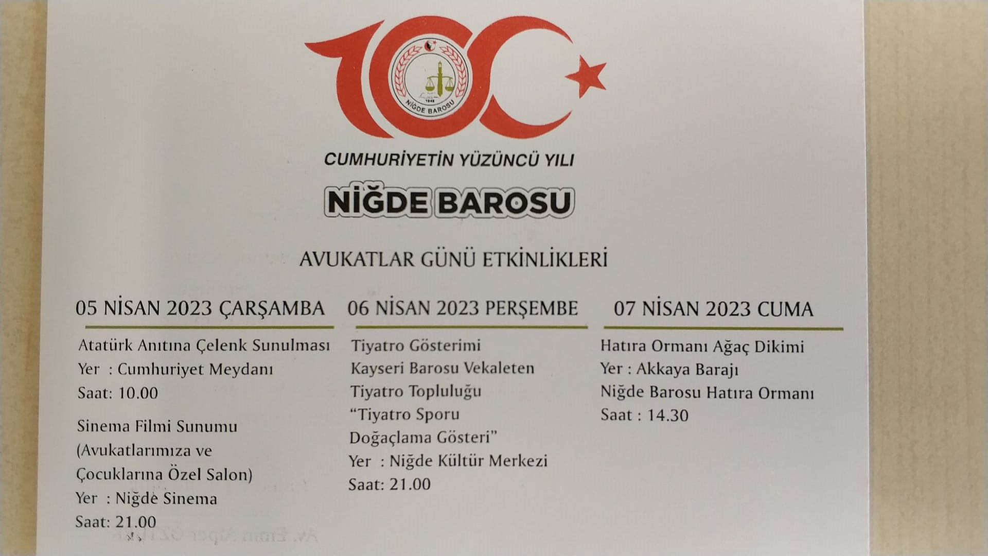 Etkinlikler bugün akşam saat 21.00'da Niğdeli avukat ve çocuklarına özel sinema filmi ile devam edecek. Yine Avukatlar Günü kapsamında 6 Nisan Perşembe günü saat 21.00'da Kültür Merkezinde Tiyatro Gösteri ve 7 Nisan Cuma günü saat 14.30'da Hatıra Ormanı'na ağaç dikimi etkinlikleri yapılacak.