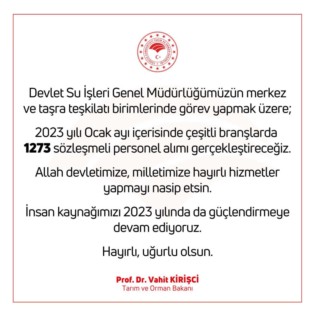 Tarım ve Orman Bakanı Vahit Kirişçi, sosyal medya hesabından yaptığı paylaşımında önümüzdeki günlerde Devlet Su İşleri Genel Müdürlüğü'nün (DSİ) taşra ve köylerde istihdam edilmek üzere 1273 personel alımı gerçekleştireceğini duyurdu. Bakan Kirişçi paylaşımında şu ifadelere yer verdi: "Devlet Su İşleri Genel Müdürlüğümüzün gücüne güç katacak mesai arkadaşlarımızı sabırsızlıkla bekliyoruz. Hayırlı, uğurlu olsun."