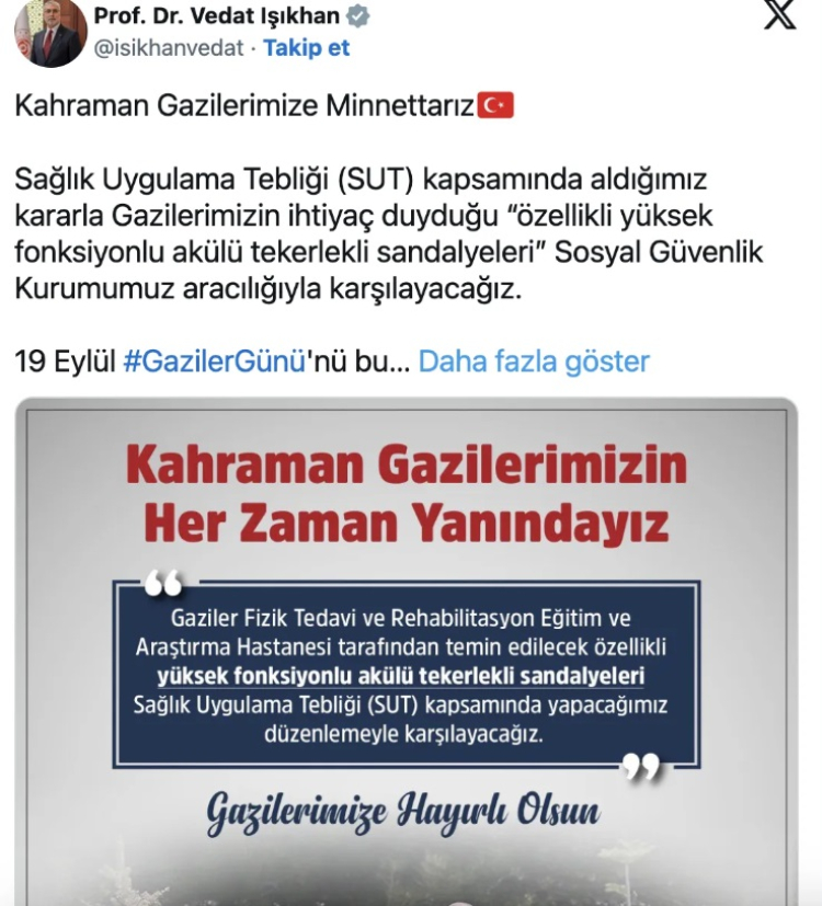 "Kahraman gazilerimize minnettarız. Sağlık Uygulama Tebliği (SUT) kapsamında aldığımız kararla gazilerimizin ihtiyaç duyduğu özellikli, yüksek fonksiyonlu, akülü tekerlekli sandalyeleri Sosyal Güvenlik Kurumumuz aracılığıyla karşılayacağız. 19 Eylül Gaziler Günü'nü bu vesileyle tebrik ediyor, hayata geçireceğimiz düzenlemenin kıymetli gazilerimiz için hayırlı olmasını diliyorum."