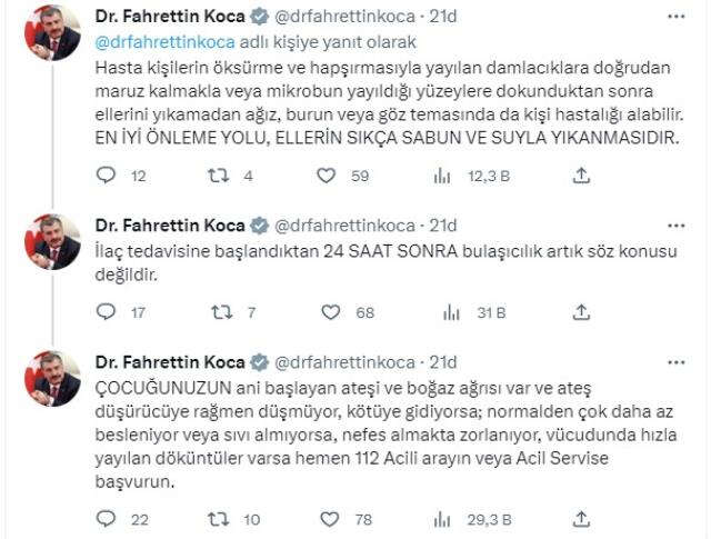 Sosyal medyadan yaptığı paylaşımda Bakan Koca, şunları söyledi: Eylülden beri bazı Avrupa ülkelerinde A Grubu Beta-Hemolitik Streptokok vakaları bildirilmektedir. Ülkemizde de az sayıda vaka bildirilmiştir. A grubu beta-hemolitik streptokok enfeksiyonlarının çoğu boğaz iltihabı veya ciltte enfeksiyon şeklinde ve kısmen hafif enfeksiyonlardır.