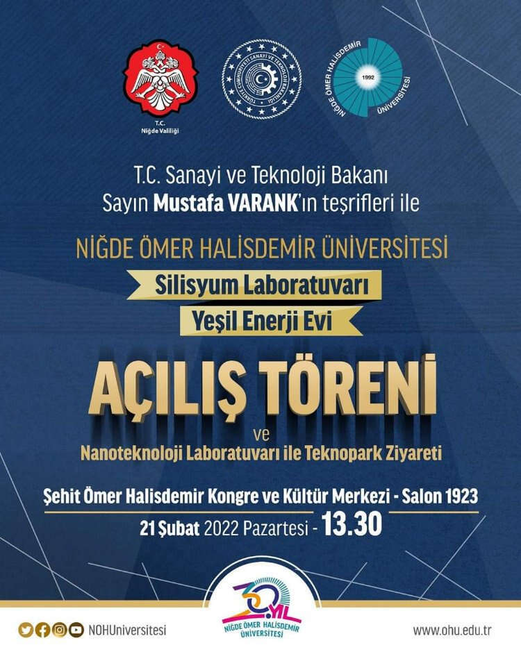 Türkiye Cumhuriyeti Sanayi ve Teknoloji Bakanı Mustafa Varank, Niğde Ömer Halisdemir Üniversitesinde Silisyum Laboratuvarı ve Yeşil Enerji Evi açılış törenine katılmak için Niğde'ye geliyor.
